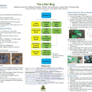 Trained a machine learning neural network to identify litter in videos using Tensorflow Lite and Python: Configured the SSD-MobileNet-V2 object detection model on a Raspberry Pi; Presented at the AIAA Mid-Atlantic Young Professionals, Students, and Educators (YPSE) Conference.